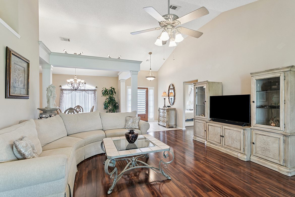 Spacious Living Room with Gas Fireplace: The living room is the perfect gathering spot, featuring a cozy gas fireplace and updated ceiling fans and light fixtures that enhance both aesthetics and energy efficiency.