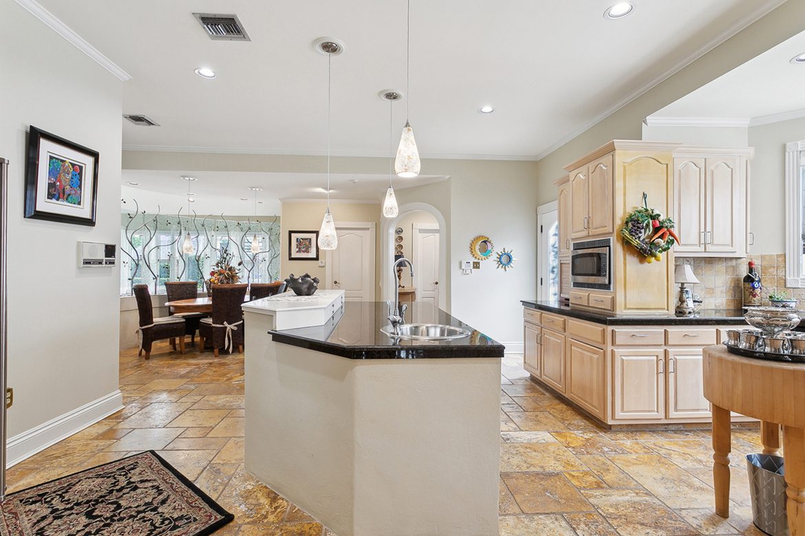 Kitchen & Breakfast Area: Granite and Corian countertops, custom pickled oak cabinets, Sub-Zero refrigerator, Italian tile flooring, a breakfast bar, a curved planter in the Breakfast Area, and an extra counter worktop.