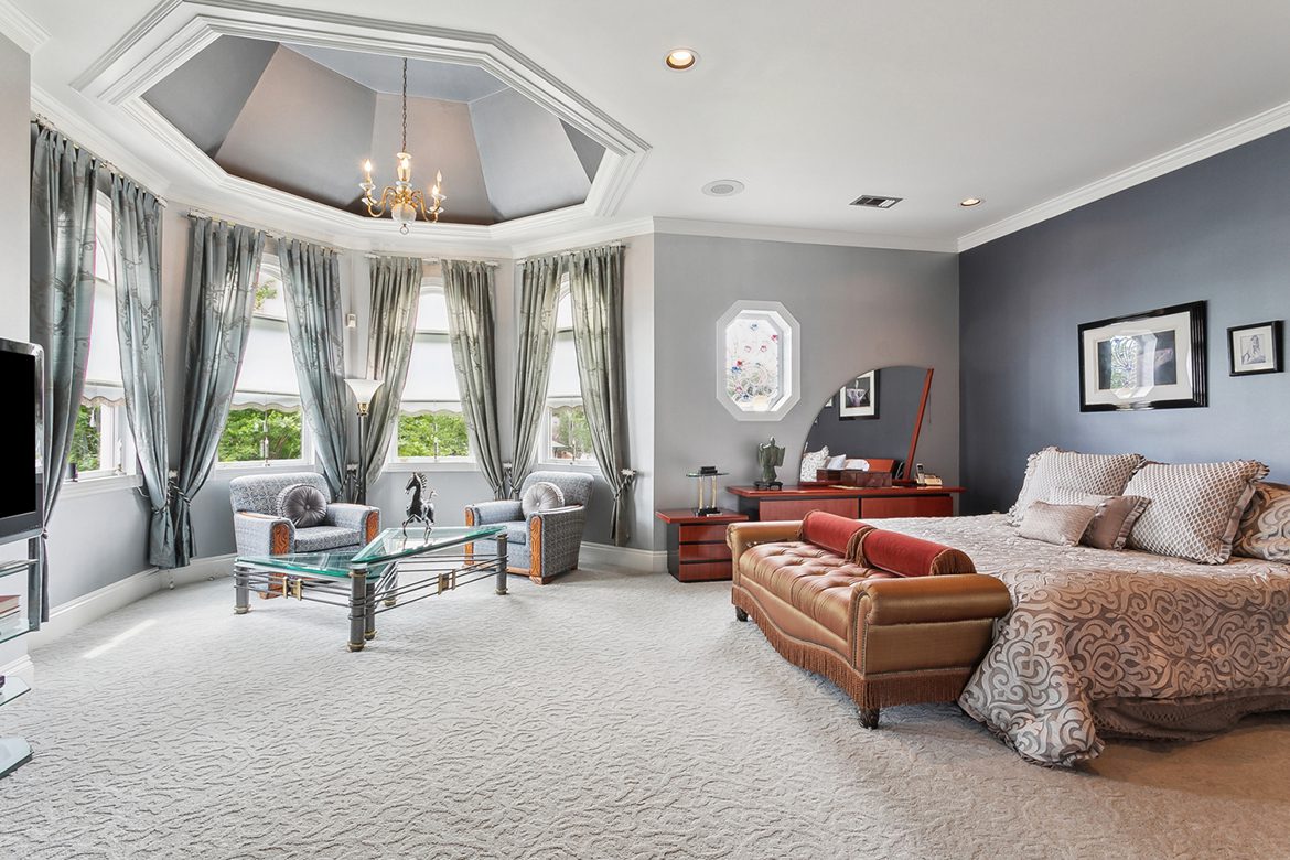 2nd floor Primary Bedroom Suite: Includes a turreted sitting area, a marble fireplace, crown molding, and stained glass. The bath features dual vanities, a cultured marble jetted tub, a glass block shower, and a large walk-in closet.