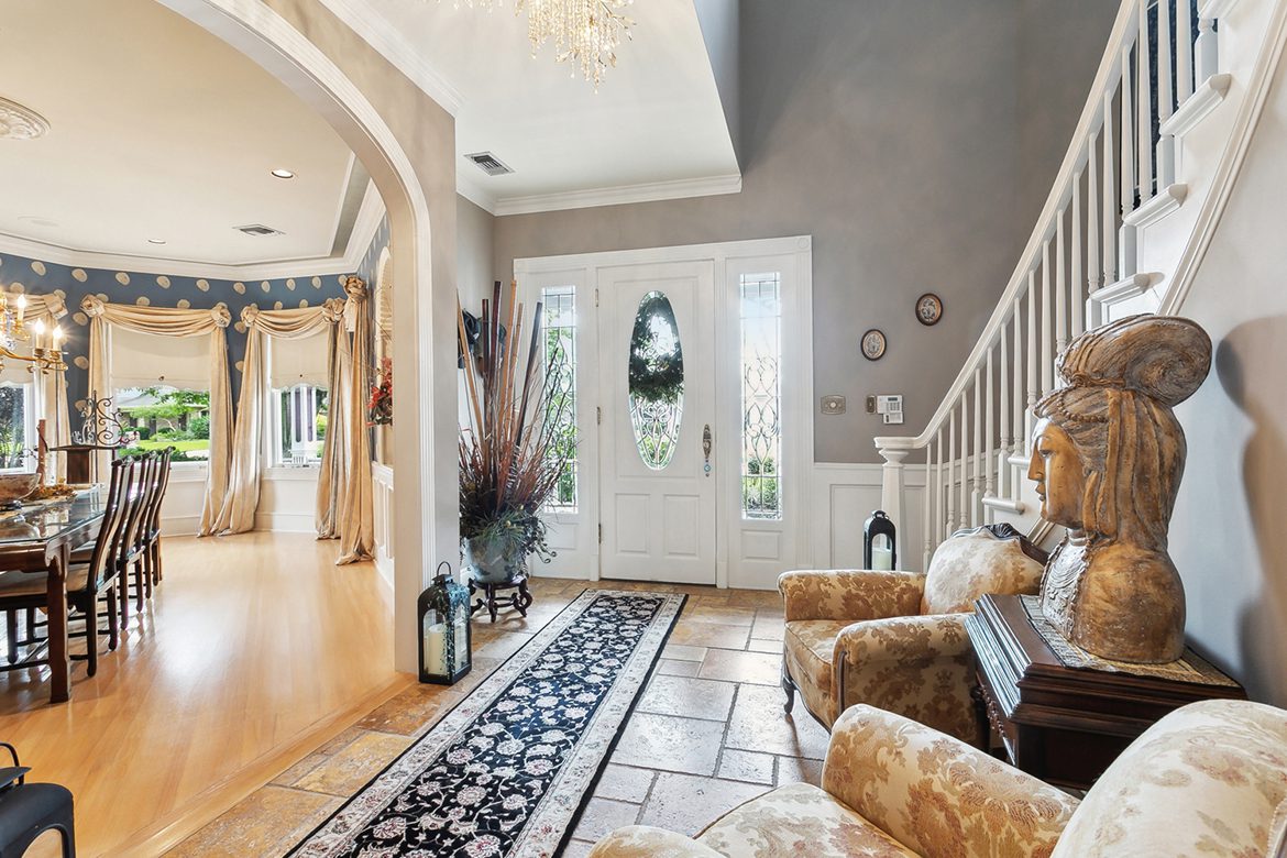 Foyer: Italian marble flooring, a gracefully curved stairway, crystal chandelier, stained glass window, and a coat closet under the stairs.