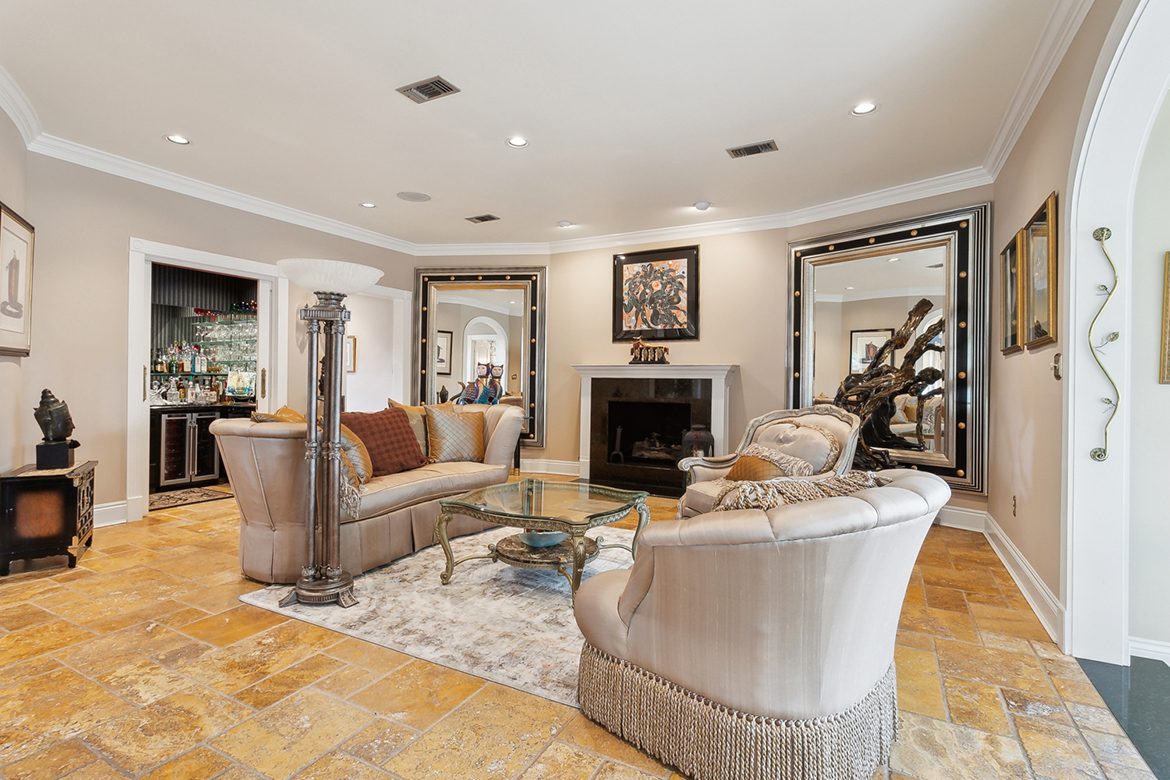 Greatroom: Warm and inviting with a marble-trimmed wood-burning fireplace, open view to the solarium, a full wet bar with marble countertops, and a wine closet.