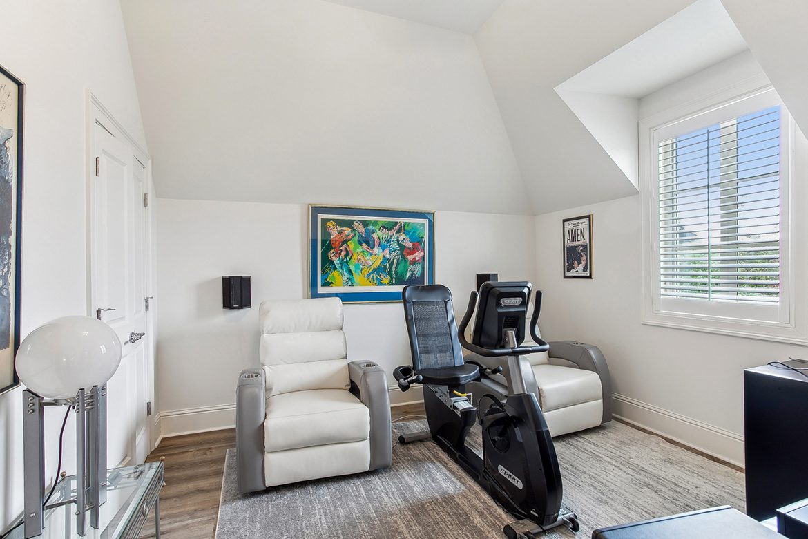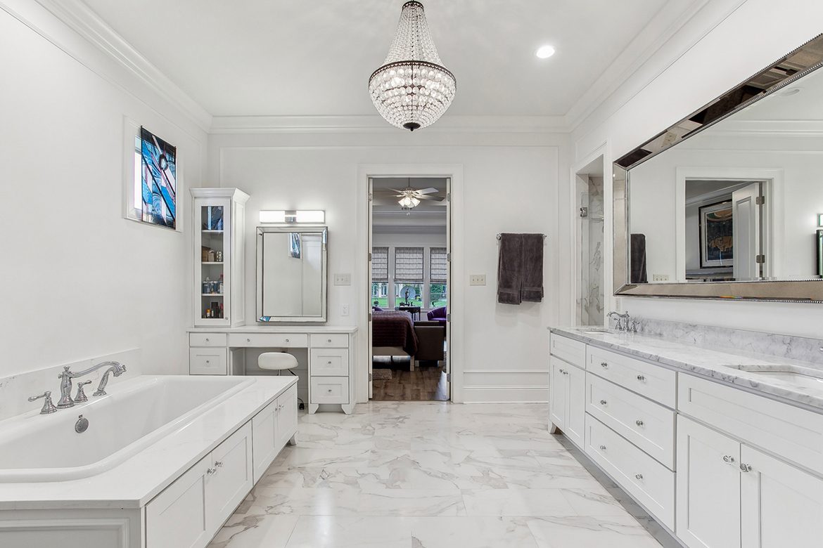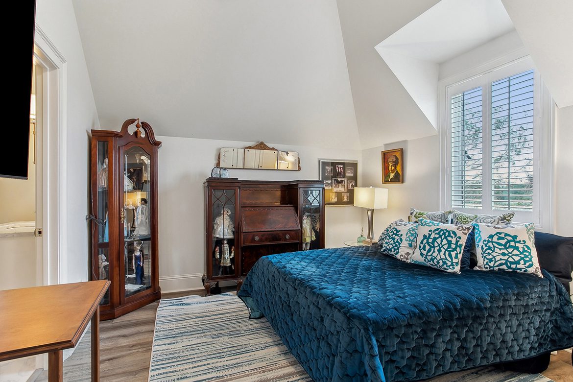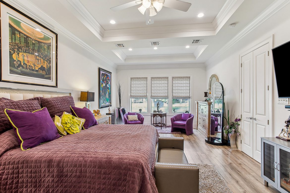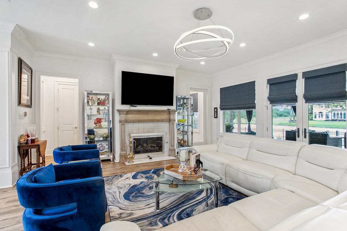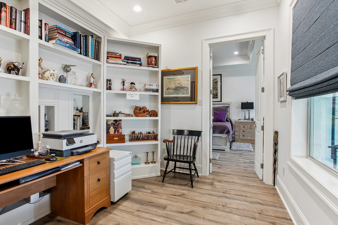 This custom home was built in 2017 by Hollingsworth Design. This elegant home for sale is located on the largest lot in the cul-de-sac overlooking the lake! The living room features a gas fireplace with a remote and an abundance of windows providing natural light and lake views. The gourmet kitchen has an oversized island with marble countertops, soft-close drawers, ample cabinetry, Bosch appliances; except for the oven, which is a Bertazzoni brand with a 6-burner range. The luxurious primary suite downstairs has its own wing of the house for extra privacy and a seating area with electric shades that looks out over the lake. The primary bathroom features dual vanities, a huge walk-in closet, an extra large, walk-in shower, a seated vanity wall, built-in closet storage, and a bidet. This completely custom home also includes a whole-house generator, tankless water heater, marble countertops throughout – even the laundry room, and an extended garage with ample storage space, which is also big enough for a boat. A unique design feature of this home for sale is located in the office space which features built-in shelving with a secret door opening into a closet area with built-in safe.