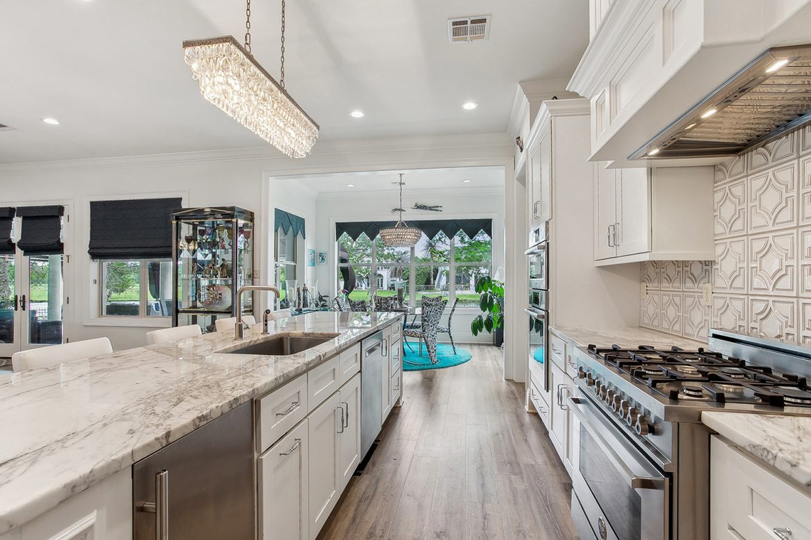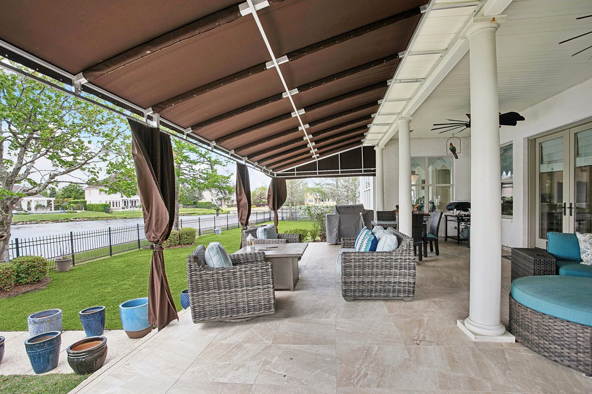 A butler’s pantry with marble countertops added, additional cabinetry in the laundry room added, a Chihuly original signed light fixture in the dining room, an added extension to the the back patio, and an awning plus curtains for shade & privacy added to the covered porch.
