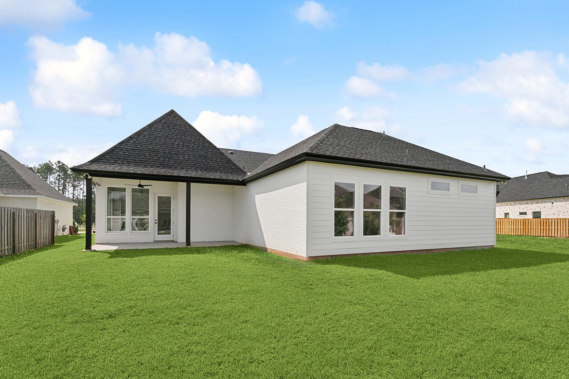 The opulent primary bath has a modern touch with custom sconce lighting, custom framed mirrors, undermount sinks, and sleek plumbing fixtures. The large shower and stand-alone tub showcase dark, custom tile walls and window trim, completing the contemporary design. All of the bedrooms have ceiling fans and spacious closets. The builder included interesting and unique tiling in one of the secondary baths. This new home offers stylish vinyl wood floors throughout, complemented by tiled bathrooms and laundry areas. Step outside to the covered rear patio, perfect for relaxing or entertaining. Plus, a large walk-in attic in the garage has a pull-down option which provides additional storage space.
