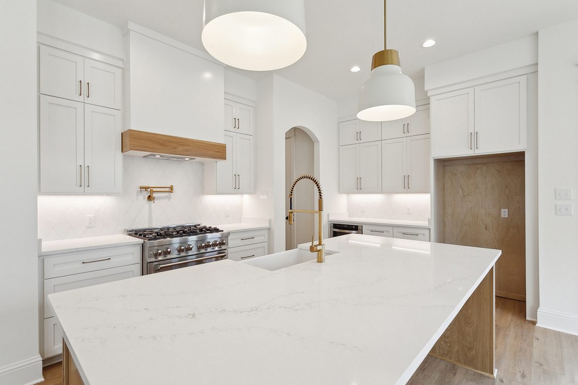 The full-sized kitchen island has matching real wood trim and comes with a farmhouse sink, which adds a charming touch. The kitchen boasts modern stainless steel appliances, including a gas stove with a convenient pot filler, a stainless steel microwave, and a dishwasher. The kitchen also features a walk-in pantry with custom shelving, ensuring plenty of storage for all your essentials. Adjacent to the kitchen, the garage leads into a practical mudroom complete with custom cubbies and hooks, ideal for organizing shoes and bags.